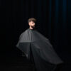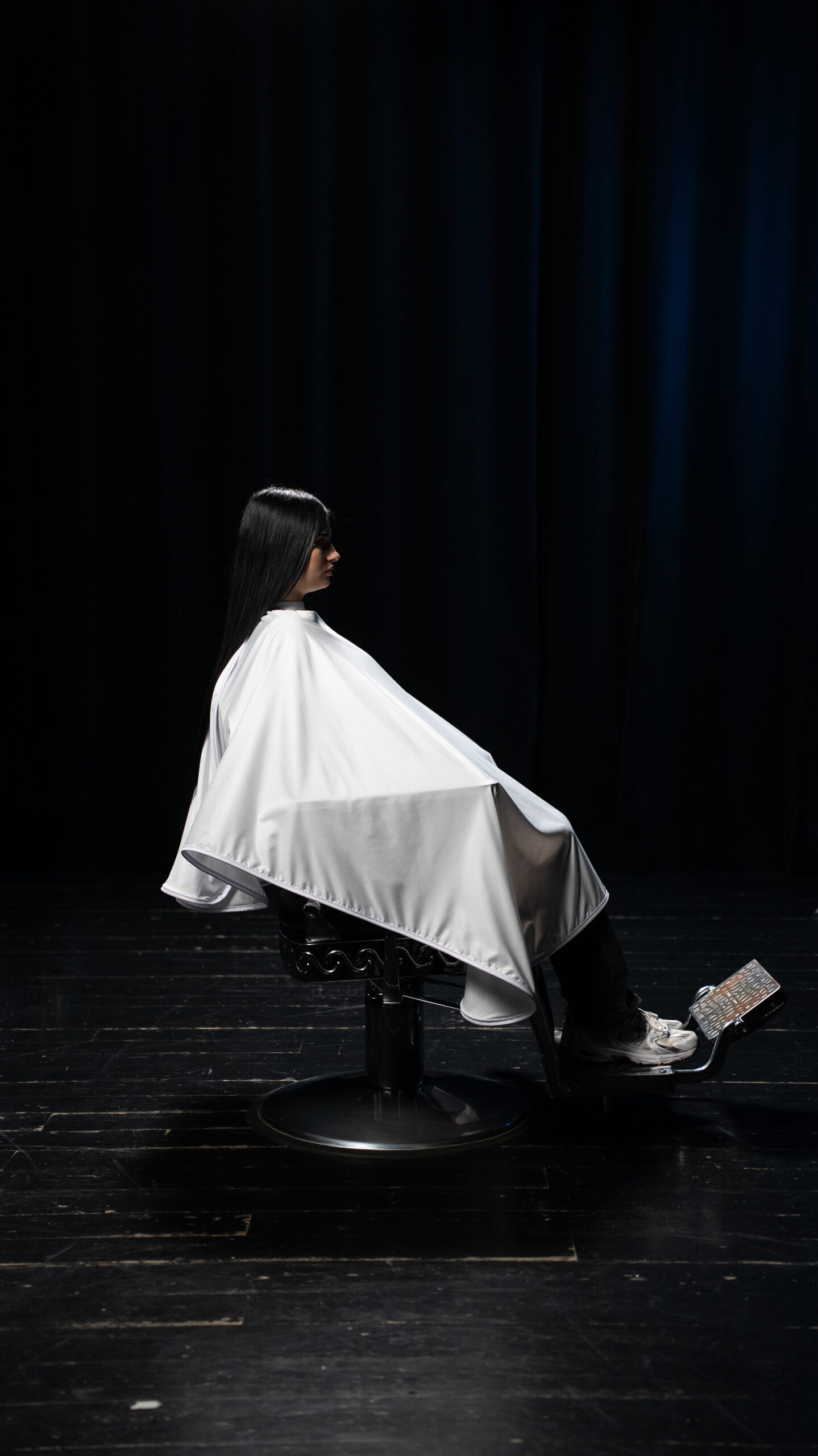 Specjalny obciążnik rozmieszczony wzdłuż całego obwodu peleryny zapewnia jej idealne ułożenie na kliencie siedzącym w fotelu, dając wrażenie perfekcyjnego dopasowania. Zastosowana technologia sprawia, że woda i włosy błyskawicznie spływają po powierzchni tkaniny, utrzymując pelerynę w czystości i estetycznym wyglądzie.